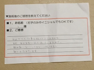 施術後は、体の痛みがだいぶ和らぎ、体の姿勢が良くなっているのを実感します。施術中も私がつい余計なおしゃべりをするのですが先生はいつも穏やかにやさしく聞いてくださり、とても感謝しております。私にとっては至福の時です。そして、少し何かやってみようかなと思えるようになりました。痛みがとれてきたので少しずつですが前向きな気持ちになっているようです。もっと元気なって、色々と挑戦したいです。これからもよろしくお願いします。