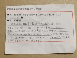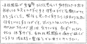 整体を思いきって受けたら1回目より右足に体重をかけて歩ることができ、びっくりしうれしくなりました。